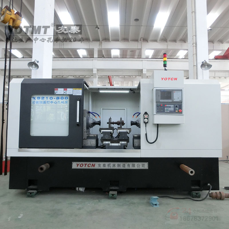 开元(中国)机床设计生产的ZK8210-800铣端面打中心孔机床实现一次装夹,同时完成工件两端加工,确保轴件箱体类零件两端精度高度一致性,节省工时,提高效率300%以上。